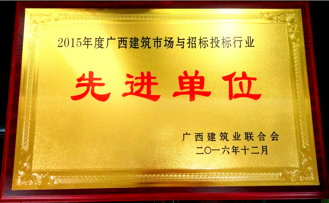 會上,廣西建筑業聯合會建筑市場與招標投標研究分會常務副會長周永頌通報了13家榮獲“2015-2016年度全國招標代理機構誠信先進單位”的名單,我公司獲得了此項殊榮;常務副會長劉藝宣讀了表彰的決定,有關領導向34家榮獲2015年度廣西建筑市場與招標投標行業先進單位和63位先進個人頒發獎牌、榮譽證書,我公司榮獲先進單位,4位同志榮獲先進個人稱號。