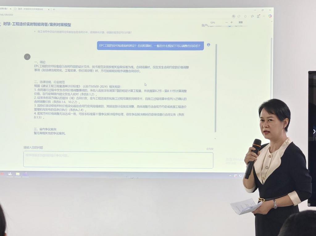 活動交流現場," 時慧 " 工程造價實時智能詢答與案例對策模型成為大家交流的焦點,技術人員現場演示了模型在造價爭議、上控編制、過程跟蹤、結算審核等方面中遇到問題時,向模型直接提問后," 時慧 " 快速給出答復并提供規范依據。該模型多場景的演示,令與會人員眼前一亮,實實在在感受到人工智能技術在咨詢領域場景中發揮的實際作用。